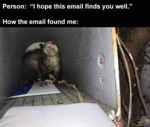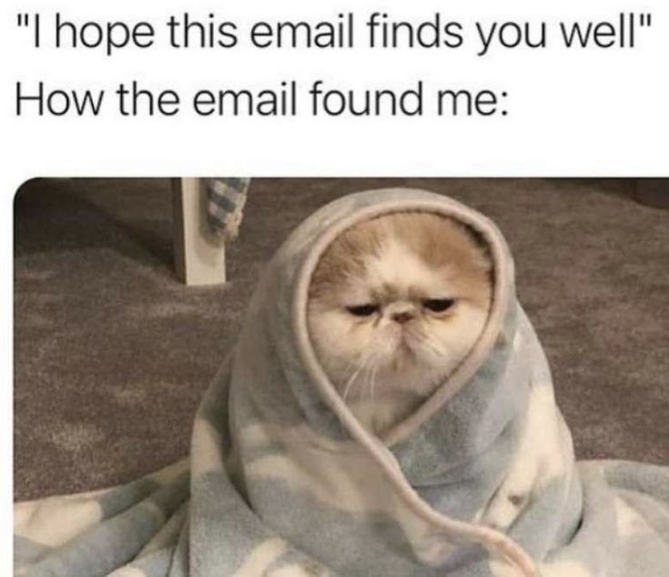 This meme format follows a simple structure. Users quote the formal greeting “I hope this email finds you well” followed by an image showing exactly how the email actually found them—typically exhausted, stressed, or barely functioning.